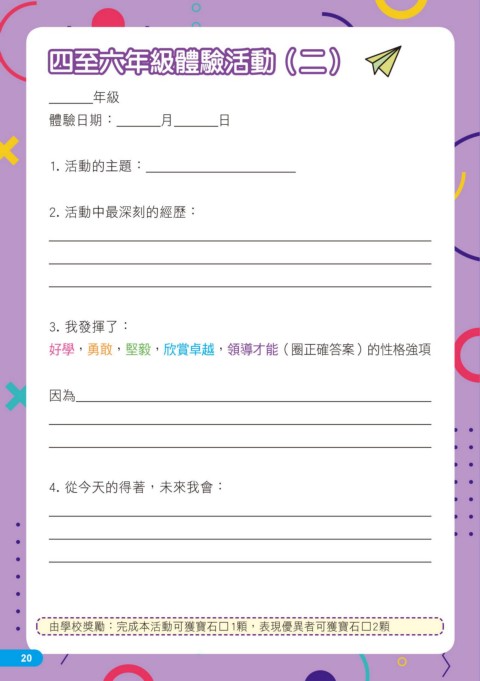 四至六年級體驗活動(二) 年級 體驗日期: 月 日 1. 活動的主題: 2. 活動中最深刻的經歷: 3. 我發揮了: 好學,勇敢,堅毅,欣賞卓越,領導才能(圈正確答案)的性格強項 因為 4. 從今天的得著,未來我會: 由學校獎勵:完成本活動可獲寶石□1顆,表現優異者可獲寶石□2顆 20