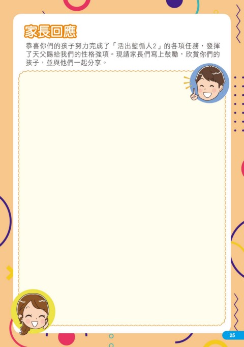家長回應 恭喜你們的孩子努力完成了「活出藍循人2」的各項任務,發揮 了天父賜給我們的性格強項。現請家長們寫上鼓勵,欣賞你們的 孩子,並與他們一起分享。 25