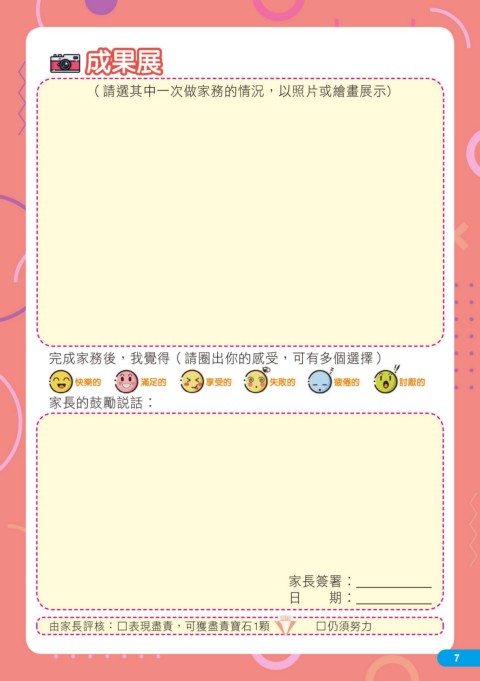 成果展 (請選其中一次做家務的情況,以照片或繪畫展示) 完成家務後,我覺得(請圈出你的感受,可有多個選擇) 快樂的 滿足的 享受的 失敗的 疲倦的 討厭的 家長的鼓勵說話︰ 家長簽署︰ 日 期︰ 由家長評核:□表現盡責,可獲盡責寶石1顆 □仍須努力 7