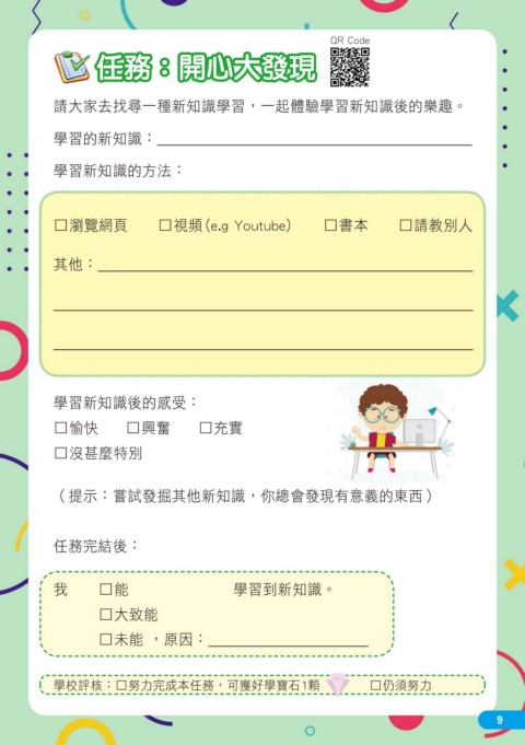 QR Code 任務:開心大發現 請大家去找尋一種新知識學習,一起體驗學習新知識後的樂趣。 學習的新知識: 學習新知識的方法: □瀏覽網頁 □視頻(e.g Youtube) □書本 □請教別人 其他: 學習新知識後的感受: □愉快 □興奮 □充實 □沒甚麼特別 (提示:嘗試發掘其他新知識,你總會發現有意義的東西) 任務完結後: 我 □能 學習到新知識。 □大致能 □ 未能 ,原因: 學校評核:□努力完成本任務,可獲好學寶石1顆 □仍須努力 9