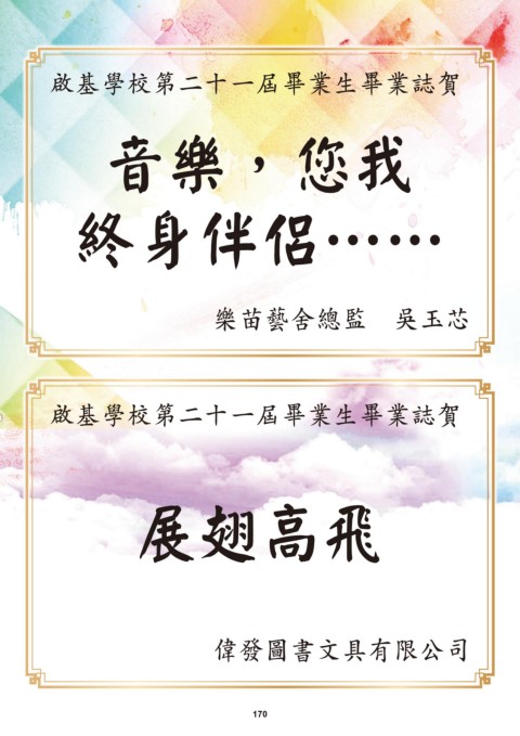 啟基學校第二十一屆畢業生畢業誌賀 音樂,您我 終身伴侶…… 樂苗藝舍總監 吳玉芯 啟基學校第二十一屆畢業生畢業誌賀 展翅高飛 偉發圖書文具有限公司 170 170