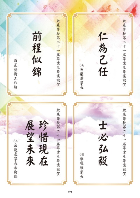 啟 基學校第二十一屆畢業生畢業誌賀 啟 基學校第二十一屆畢業生畢業誌賀 似 錦 前 程 為 仁 任 己 工 作 坊 星 酉 術 藝 6A 澄 長 樂 家 吳 啟 基學校第二十一屆畢業生畢業誌賀 啟 基學校第二十一屆畢業生畢業誌賀 望 展 來 未 現 惜 珍 在 士 必 弘 毅 6A 鋒 倫 長 家 余 豪 余 浚 6H 長 張 家 瓏 耀 172 172