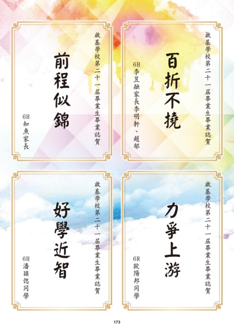啟 基學校第二十一屆畢業生畢業誌賀 啟 基學校第二十一屆畢業生畢業誌賀 錦 前 程 似 百 折 撓 不 6H 明 、 趙 郁 融 昱 軒 李 李 家 長 6H 長 魚 知 家 啟 基學校第二十一屆畢業生畢業誌賀 啟 基學校第二十一屆畢業生畢業誌賀 近 智 學 好 力 爭 上 游 6H 6R 學 邦 陽 學 潘 頴 同 同 歐 偲 173 173