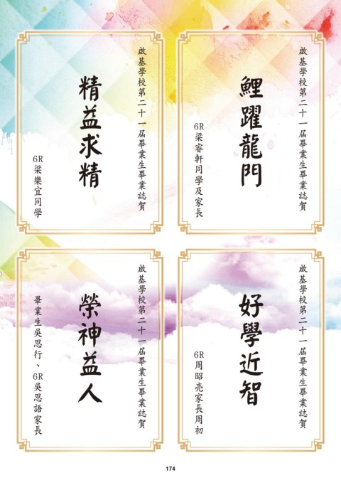 啟 基學校第二十一屆畢業生畢業誌賀 啟 基學校第二十一屆畢業生畢業誌賀 求 精 精 益 躍 鯉 門 龍 6R 家 同 長 及 學 梁 軒 睿 6R 宜 樂 學 同 梁 啟 基學校第二十一屆畢業生畢業誌賀 啟 基學校第二十一屆畢業生畢業誌賀 益 人 榮 神 好 學 智 近 業 畢 、 生 吳 思 行 6R 周 昭 初 家 長 周 亮 6R 長 吳 語 家 思 174 174