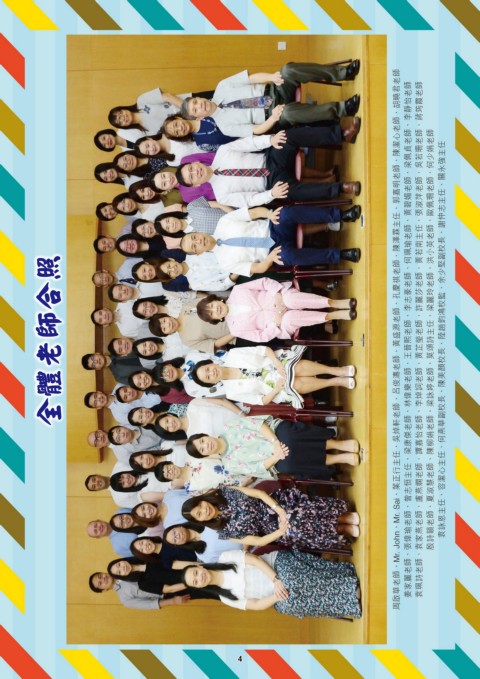 4 4 周啟華老師、Mr. John、Mr. Sai、葉正行主任、吳焯軒老師、呂俊濤老師、黃盛源老師、孔慶祺老師、陳澤霖主任、郭嘉明老師、陳潔心老師、胡曉君老師 姜家麗老師、張偉瑜老師、曾志恒主任、梁康傑老師、林偉樂老師、王晉熙老師、李志豪老師、何珮瑜老師、黃碧媚老師、梁佩貞老師、李靜怡老師 袁珮詩老師、袁家燕老師、盧燕嫻老師、譚嘉怡老師、李焯詞老師、黃芷瑩老師、許麗莎老師、黃若南主任、張淑萍老師、吳若珊老師、蔣筠霞老師 殷詩韻老師、夏淑慧老師、陳柳娟老師、梁詠婷老師、莫頌詩主任、梁麗玲老師、洪小英老師、歐佩珊老師、何少娟老師 袁詠恩主任、容潔心主任、何燕華副校長、陳美顏校長、陸趙鈞鴻校監、余少堅副校長、謝仲志主任、關永強主任