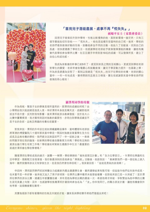 當中,一年一年地成長,變得開朗而且意志力增強,實在很感謝鄧英喜中學老師們對