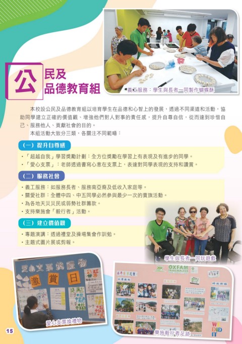 本校設公民及品德教育組以培育學生在品德和心智上的發展,透過不同渠道和活動,協