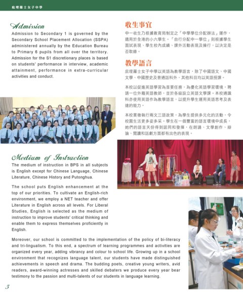attainment, performance in extra-curricular 庇理羅士女子中學以英語為教學語言,除了中國語文、中國