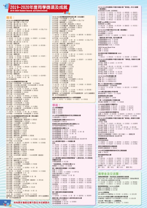 男子丙組:400米亞軍、跳高亞軍 2D 洪祖彥 3A 林巧怡、3A 黃浩茵、4C 梁寶兒、4C 鄧漪澄、4D 余卓榣、 應用學習獎學金(2019-20年度)