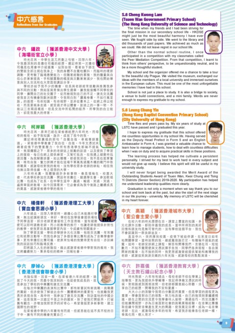 予同學溫習,部分老師更會留校工作至傍晚,當有疑難 在校六年的時光歷歷在目。課堂上豐富的知識、多