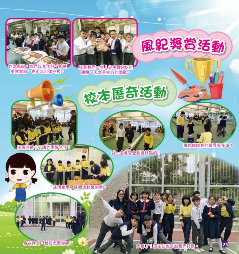 風紀獎賞活動 作為風紀,我們以身作則,即使 這是我們一生人之中最好吃的 美食當前,也不忘自律守規。 薄餅,因為是校方的獎勵。 乘風航活動 校本歷奇活動 這個活動十分講究團隊合作! 讓你瞧瞧我的眼界有多準! 我一定會安全到達終點的! 「珠傳萬里」這個活動真刺激。 身在迷宮,我該怎麼辦呢? 23 太棒了!班主任也來為我們打氣。