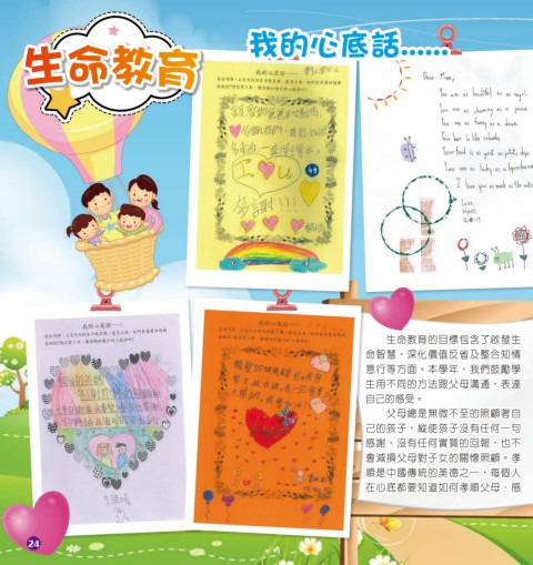 我的心底話...... 生命教育 生命教育的目標包含了啟發生 命智慧,深化價值反省及整合知情 意行等方面。本學年,我們鼓勵學 生用不同的方法跟父母溝通,表達 自己的感受。 父母總是無微不至的照顧著自 己的孩子,縱使孩子沒有任何一句 感謝、沒有任何實質的回報,也不 會減損父母對子女的關懷照顧。孝 順是中國傳統的美德之一,每個人 在心底都要知道如何孝順父母、感 24