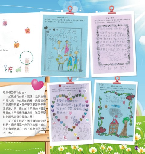 恩父母的無私付出。 如果沒有爸爸、媽媽,我們能順 利長大嗎?在成長的過程中需要父母 的呵護與照顧,我們要怎麼跟他們表 示感謝之意?用說的?用寫的?還是 用畫的?不管用什麼方法,孩子們要 時刻謹記父母的養育之恩! 從「愛」開始,讓父母知道你愛 他們,適時顯露出自己的心情,彼此 的心會漸漸靠在一起,成為相依相偎 的一家人。 25