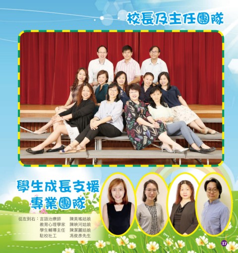 校長及主任團隊 學生成長支援 專業團隊 從左到右:言語治療師 陳美瑤姑娘 教育心理學家 陳映河姑娘 學生輔導主任 陳潔麗姑娘 駐校社工 馮俊彥先生 37