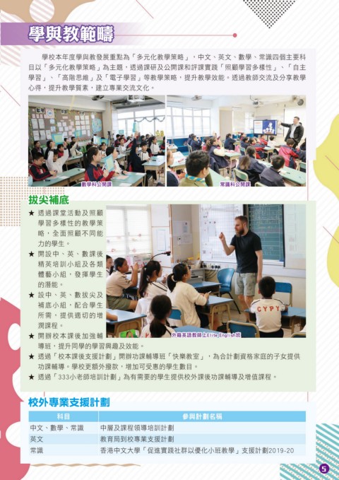 學校本年度學與教發展重點為「多元化教學策略」,中文、英文、數學、常識四個主要科