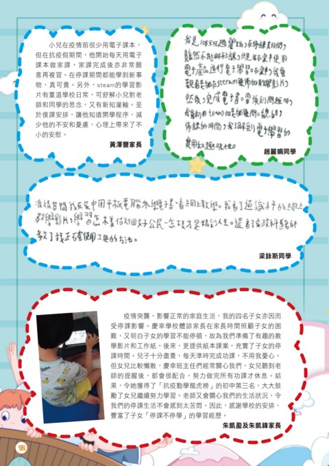 學影片和工作紙。後來,更提供紙本課業,充實了子女的停