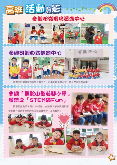 高班 活動剪影 參觀粉嶺環境資源中心 參觀可觀自然教育中心 將教室的學習環境延伸至教室外,同學們能擴闊視野,學習及探索新知識。 參觀「馬鞍山聖若瑟小學」 舉辦之「STEM滿Fun」 同學們能動手參與STEM活動,主動尋求解決問題和探 索創造,透過多元化的方法來認識世界,真有趣啊! 17
