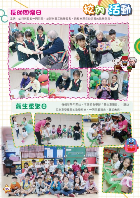 校內 活動 長幼同樂日 當天,幼兒與長者一同茶聚,並製作圖工送贈長者,過程充滿長幼共融的歡樂氣氛。 舊生重聚日 每個新學年開始,本園都會舉辦「舊生重聚日」,讓幼 兒能享受重聚的歡樂時光,一同回顧過去,展望未來。 20