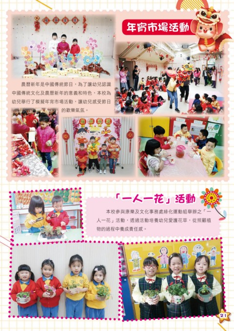 年宵市場活動 農曆新年是中國傳統節日,為了讓幼兒認識 中國傳統文化及農曆新年的意義和特色,本校為 幼兒舉行了模擬年宵市場活動,讓幼兒感受節日 的歡樂氣氛。 「一人一花」活動 本校參與康樂及文化事務處綠化運動組舉辦之「一 人一花」活動,透過活動培養幼兒愛護花草,從照顧植 物的過程中養成責任感。 21