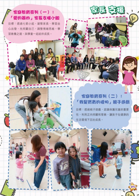 家長 支援 家庭教育系列(一): 「愛的器皿」家長支援小組 目標:透過七節小組,凝聚家長,學習由 心出發,先照顧自己,調整情緒思維,學 習教養之道,與學童一起結伴成長。 家庭教育系列(二): 「我是寶貴的禮物」親子遊戲 目標:透過親子遊戲,認識保護兒童的重要 性,利用正向照顧和管教,讓孩子在健康的 生活環境下茁壯成長。 29