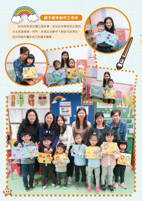 親子繪本創作工作坊 幼兒與家長共讀三個故事,幼兒從中學習用正面的 方法表達情緒。同時,家長在活動中了解幼兒的想法, 並共同創作屬於自己的繪本圖書。 32