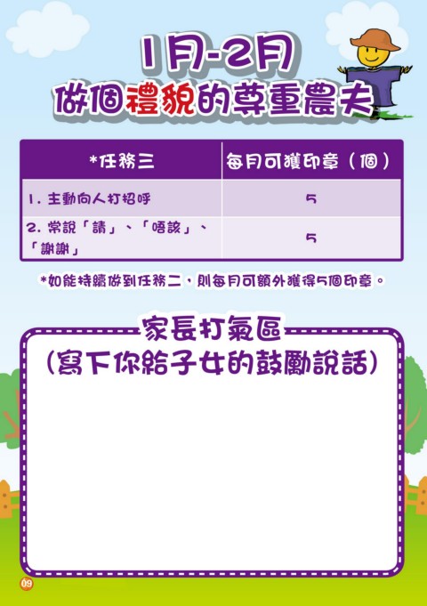 1月-2月 做個禮貌的尊重農夫 *任務三 每月可獲印章(個) 1. 主動向人打招呼 5 2. 常說「請」、「唔該」、 5 「謝謝」 *如能持續做到任務二,則每月可額外獲得5個印章。 家長打氣區 (寫下你給子女的鼓勵說話) 09