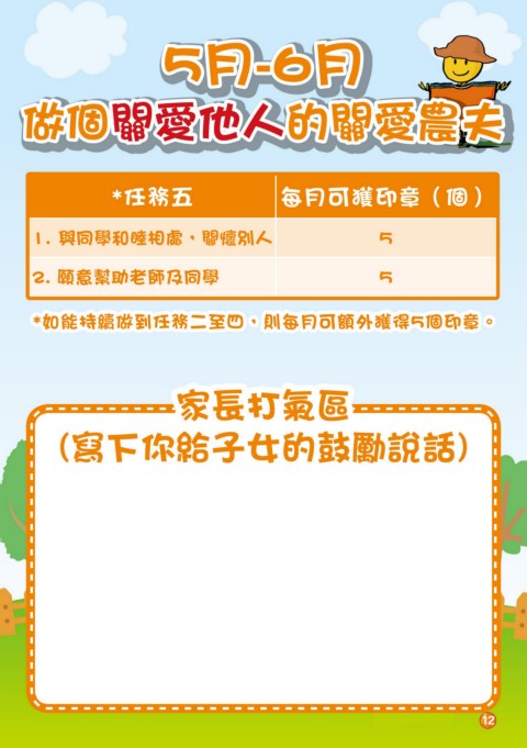 5月-6月 做個關愛他人的關愛農夫 *任務五 每月可獲印章(個) 1. 與同學和睦相處,關懷別人 5 2. 願意幫助老師及同學 5 *如能持續做到任務二至四,則每月可額外獲得5個印章。 家長打氣區 (寫下你給子女的鼓勵說話) 12
