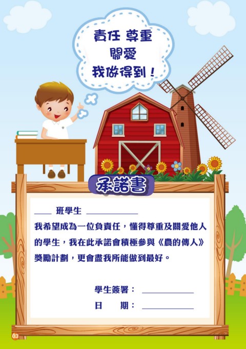 責任 尊重 關愛 我做得到 ! 承諾書 班學生 我希望成為一位負責任,懂得尊重及關愛他人 的學生,我在此承諾會積極參與《農的傳人》 獎勵計劃,更會盡我所能做到最好。 學生簽署: 日 期: 03