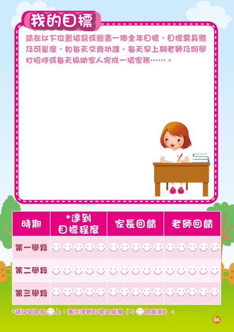 我的目標 請在以下位置填寫或繪畫一個全年目標,目標需具體 及可量度,如每天交齊功課、每天早上與老師及同學 打招呼或每天協助家人完成一項家務……。 *達到 時期 家長回饋 老師回饋 目標程度 第一學段 第二學段 第三學段 *請以填色在 上,表示達到目標之程度(5 為最高)。 04