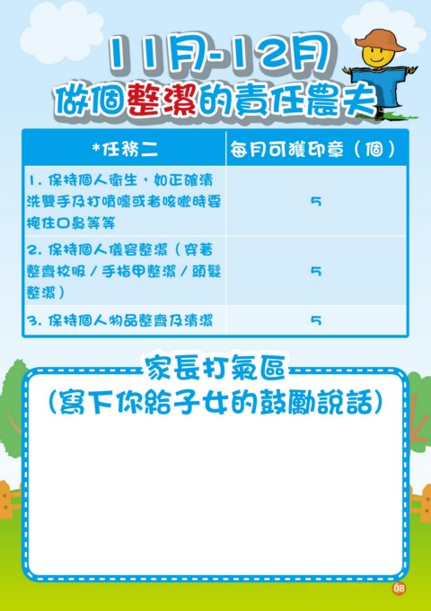 11月-12月 做個整潔的責任農夫 *任務二 每月可獲印章(個) 1. 保持個人衛生,如正確清 洗雙手及打噴嚏或者咳嗽時要 5 掩住口鼻等等 2. 保持個人儀容整潔(穿著 整齊校服∕手指甲整潔∕頭髮 5 整潔) 3. 保持個人物品整齊及清潔 5 家長打氣區 (寫下你給子女的鼓勵說話) 08