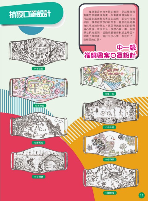 抗疫口罩設計 禪繞畫是來自美國的藝術,是以簡單而 重覆的筆觸構成圖畫。在重覆繪畫過程中, 可以達到既放鬆又專注的狀態,並從中得到 平靜,讓你在冥想的狀態下,靈感從腦海中 自然地流淌於筆尖。練習禪繞畫將幫助我們 用心發現,感受生活,撫慰心靈。中一級同 學在抗疫期間,透過視覺藝術科網上學習, 認識了禪繞畫,藉此平伏心情,並設計了一 些精美的口罩。 中一級 禪繞圖案口罩設計 1A曾沚殷 1B楊 怡 1B黃綽庭 1C何梓桐 1B鄭熙瑤 1D李泳欣 1C許朋鎂 1C劉凱瑩 11