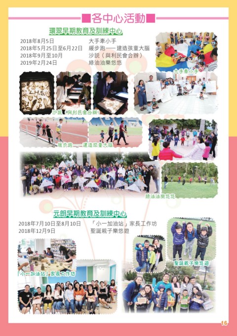 ▓各中心活動▓ 環翠早期教育及訓練中心 2018ϋ8˜5˚ ɽ˓ଘʃ˓ 2018ϋ5˜25˚Ї6˜22˚ ᇠӉൺ{ܔி܀ഁɽ໘ 2018ϋ9˜Ї10˜ ӍႭၾл͏ึΥ፬ 2019ϋ2˜24˚ ၠذذᆀઅઅ 大手牽小手 沙說(與利民會合辦) 緩步跑—建造孩童大腦 綠油油樂悠悠 元朗早期教育及訓練中心 2018ϋ7˜10˚Ї8˜10˚ ʃɓ̋ذ१ڗʈЪѥ 2018ϋ12˜9˚ ໋ሖፋɿᆀઅ༷ 聖誕親子樂悠遊 「小一加油站」家長工作坊 16