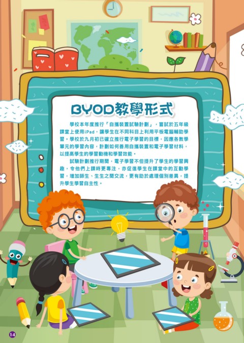 BYOD教學形式 學校本年度推行「自攜裝置試驗計劃」,嘗試於五年級 課堂上使用iPad,讓學生在不同科目上利用平板電腦輔助學 習。學校於九月初已確立推行電子學習的目標,因應各教學 單元的學習內容,計劃如何善用自攜裝置和電子學習材料, 以提高學生的學習動機和學習效能。 試驗計劃推行期間,電子學習不但提升了學生的學習興 趣,令他們上課時更專注,亦促進學生在課堂中的互動學 習,增加師生、生生之間交流,更有助於處理個別差異,提 升學生學習自主性。 14