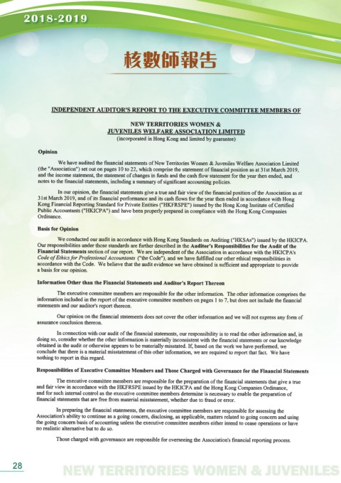 2018-2019 核數師報告 28 NEW TERRITORIES WOMEN & JUVENILES WELFARE ASSOCIATION LIMITED