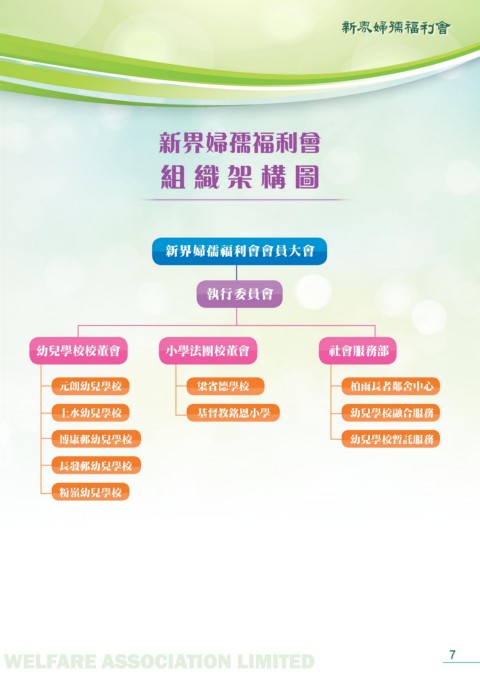 新界婦孺福利會 組織架構圖 新界婦孺福利會會員大會 執行委員會 幼兒學校校董會 小學法團校董會 社會服務部 元朗幼兒學校 梁省德學校 柏雨長者鄰舍中心 上水幼兒學校 基督教銘恩小學 幼兒學校融合服務 博康邨幼兒學校 幼兒學校暫託服務 長發邨幼兒學校 粉嶺幼兒學校 NEW TERRITORIES WOMEN & JUVENILES WELFARE ASSOCIATION LIMITED 7