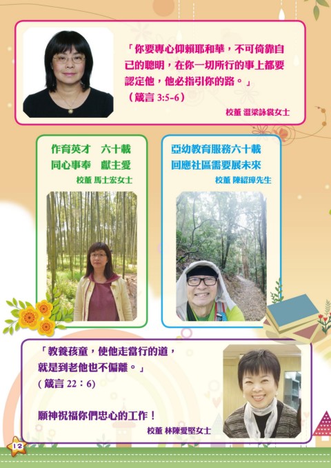 「你要專心仰賴耶和華,不可倚靠自 己的聰明,在你一切所行的事上都要 認定他,他必指引你的路。」 (箴言 3:5-6) 校董 溫梁詠裳女士 作育英才 六十載 亞幼教育服務六十載 同心事奉 獻主愛 回應社區需要展未來 校董 馬士宏女士 校董 陳紹璋先生 「教養孩童,使他走當行的道, 就是到老他也不偏離。」 ( 箴言 22:6) 願神祝福你們忠心的工作! 校董 林陳愛堅女士 12