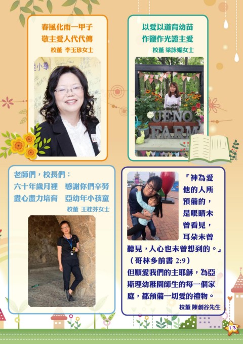 春風化雨一甲子 以愛以道育幼苗 敬主愛人代代傳 作鹽作光證主愛 校董 李玉珍女士 校董 梁詠媚女士 老師們,校長們: 「神為愛 六十年歲月裡 感謝你們辛勞 他的人所 盡心盡力培育 亞幼年小孩童 預備的, 校董 王桂芬女士 是眼睛未 曾看見, 耳朵未曾 聽見,人心也未曾想到的。」 (哥林多前書 2:9) 但願愛我們的主耶穌,為亞 斯理幼稚園師生的每一個家 庭,都預備一切愛的禮物。 校董 陳創谷先生 13