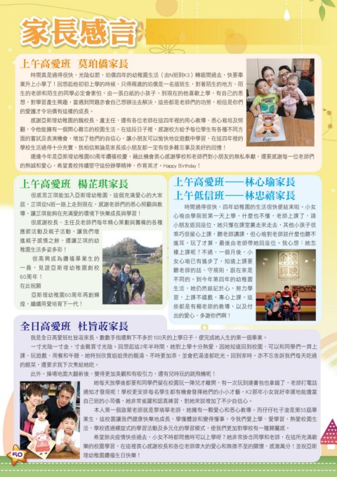 適逢今年是亞斯理幼稚園60周年鑽禧校慶,藉此機會衷心感謝學校和老師們對小朋友的無私奉獻,還要感謝每一位老師們