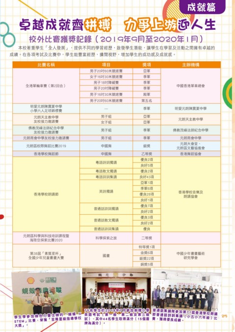 成績。在各項考試及比賽中,學生能豐富經歷,擴闊視野,增加學生的成功感及成就感。