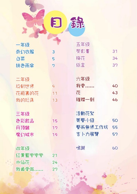 目 錄 一年級 五年級 奇幻衣服 3 剪影畫 31 白菜 5 梅花 34 拼色雨傘 7 紙盒 37 二年級 六年級 放射世界 9 我愛…… 40 花瓶裏的花 11 花 43 我的玩具 13 璀璨一刻 46 三年級 活動花絮 色彩飲品 15 美藝小組 50 丹頂鶴 17 藝術無界工作坊 55 魔幻城市 19 吉卜力展覽 57 四年級 鳴謝 60 紅黃藍變變變 21 水仙花 24 我最愛做…… 27