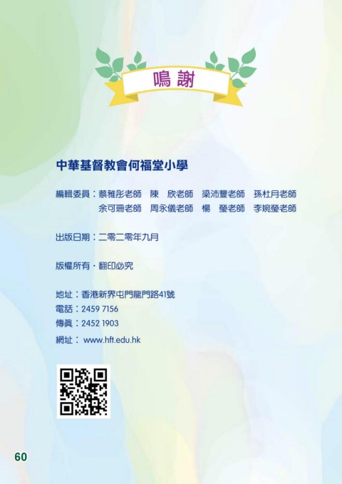 ჼ ᑽ 中華基督教會何福堂小學 編輯委員:蔡雅彤老師 陳 欣老師 梁沛豐老師 孫杜月老師 余可珊老師 周永儀老師 楊 瑩老師 李婉瑩老師 出版日期:二零二零年九月 版權所有.翻印必究 地址:香港新界屯門龍門路41號 電話:2459 7156 傳真:2452 1903 網址: www.hft.edu.hk 60