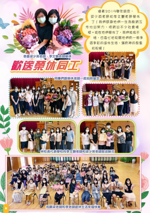 隨著2019學年結束, 梁少英老師和李文艷老師榮休 了!我們感謝他們一生為教育工 作付出努力,培育出不少社會棟 樑。現在他們榮休了,我們依依不 捨,也衷心地祝願他們有一個多 姿多彩的退休生活,滿有神的恩惠 和祝福! 恭喜梁少英老師、李文艷老師榮休 歡送榮休同工 同事們跟榮休老師一起拍照留念 林校長代表學校向李文艷老師和梁少英老師致送鮮花 8 祝願梁老師和李老師退休生活幸福快樂