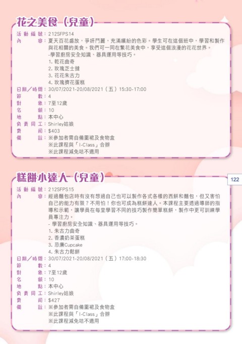 內 容 : 夏天百花盛放,爭妍鬥麗,充滿繽紛的色彩。學生可在這個班中,學習和製作