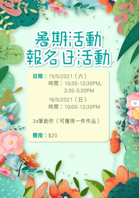 暑期活動 報名日活動 日期︰15/5/2021(六) 時間︰10:30-12:30PM, 2:30-5:30PM 16/5/2021(日) 12 時間︰10:00-12:30PM 3d筆創作(可獲得一件作品) 費用︰$20