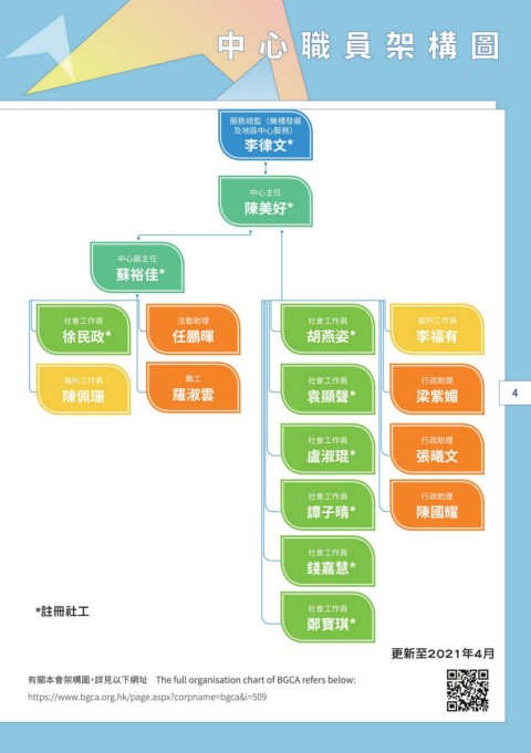 服務總監(機構發展 及地區中心服務) 李律文* 中心主任 陳美好* 中心副主任 蘇裕佳* 社會工作員 活動助理 社會工作員 福利工作員 徐民政* 任鵬暉 胡燕姿* 李福有 福利工作員 職工 社會工作員 行政助理 陳佩珊 羅淑雲 袁顯聲* 梁紫媚 4 社會工作員 行政助理 盧淑琨* 張曦文 社會工作員 行政助理 譚子晴* 陳國耀 社會工作員 錢嘉慧* *註冊社工 社會工作員 鄭寶琪* 更新至2021年4月