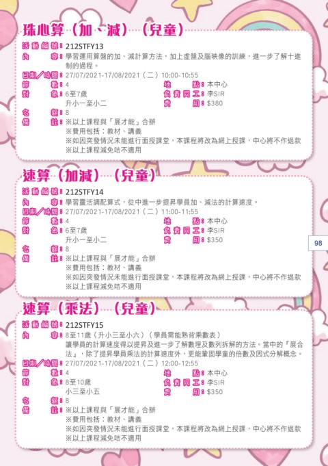 內 容 : 8至11歲(升小三至小六)(學員需能熟背乘數表)
