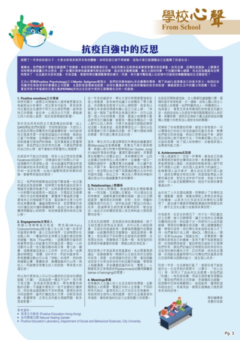 一兩份可信的報章觀看,要懂得不要過度涉獵。 的快樂感,減輕焦慮和抑鬱的風險。建立社交網 動、運動會、服務、週會或學術上參與及表現自