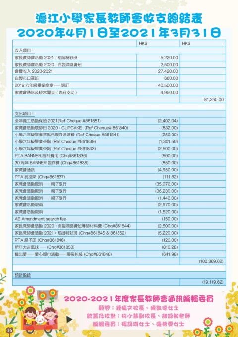家長教師會活動 2021:和諧粉彩班 (Chq#861845 & 861852) (5,220.00)