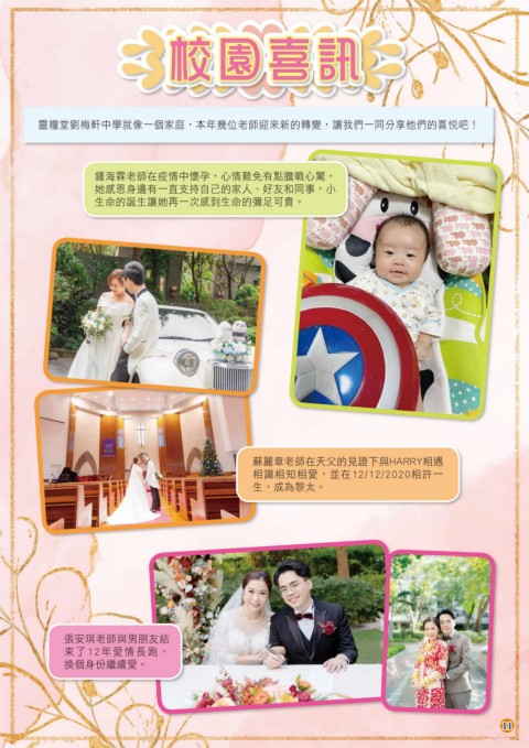 校園喜訊 校園喜訊 靈糧堂劉梅軒中學就像一個家庭,本年幾位老師迎來新的轉變,讓我們一同分享他們的喜悅吧! 鍾海霖老師在疫情中懷孕,心情難免有點膽戰心驚, 她感恩身邊有一直支持自己的家人、好友和同事,小 生命的誕生讓她再一次感到生命的彌足可貴。 蘇麗章老師在天父的見證下與HARRY相遇 相識相知相愛,並在12/12/2020相許一 生,成為黎太。 張安琪老師與男朋友結 束了12年愛情長跑, 換個身份繼續愛。 11