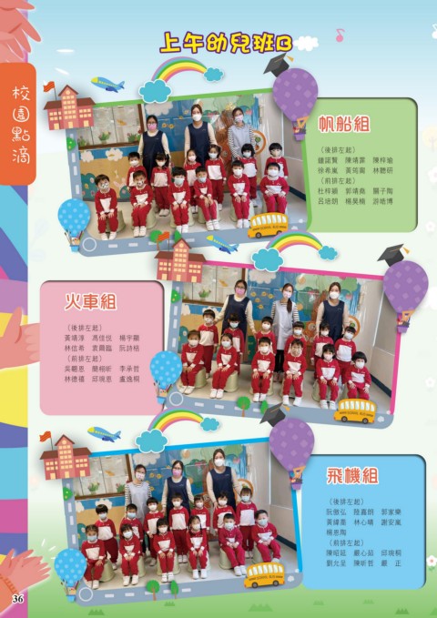 上午幼兒班B 上午幼兒班B 校園點滴 帆船組 帆船組 (後排左起) 鍾諾賢 陳靖霏 陳梓瑜 徐希嵐 黃筠甯 林聽研 (前排左起) 杜梓穎 郭靖堯 關子陶 呂培朗 楊昊楠 游皓博 火車組 火車組 (後排左起) 黃靖淳 馮佳悅 楊宇顯 林信希 袁爾臨 阮詩棓 (前排左起) 吳翱恩 簡栩昕 李承哲 林德禧 邱琬恩 盧逸桐 飛機組 飛機組 (後排左起) 阮傲弘 陸嘉朗 郭家樂 黃緯喬 林心晴 謝安嵐 楊恩陶 (前排左起) 陳昭延 嚴心茹 邱琬桐 劉允呈 陳昕哲 嚴 正 36 36